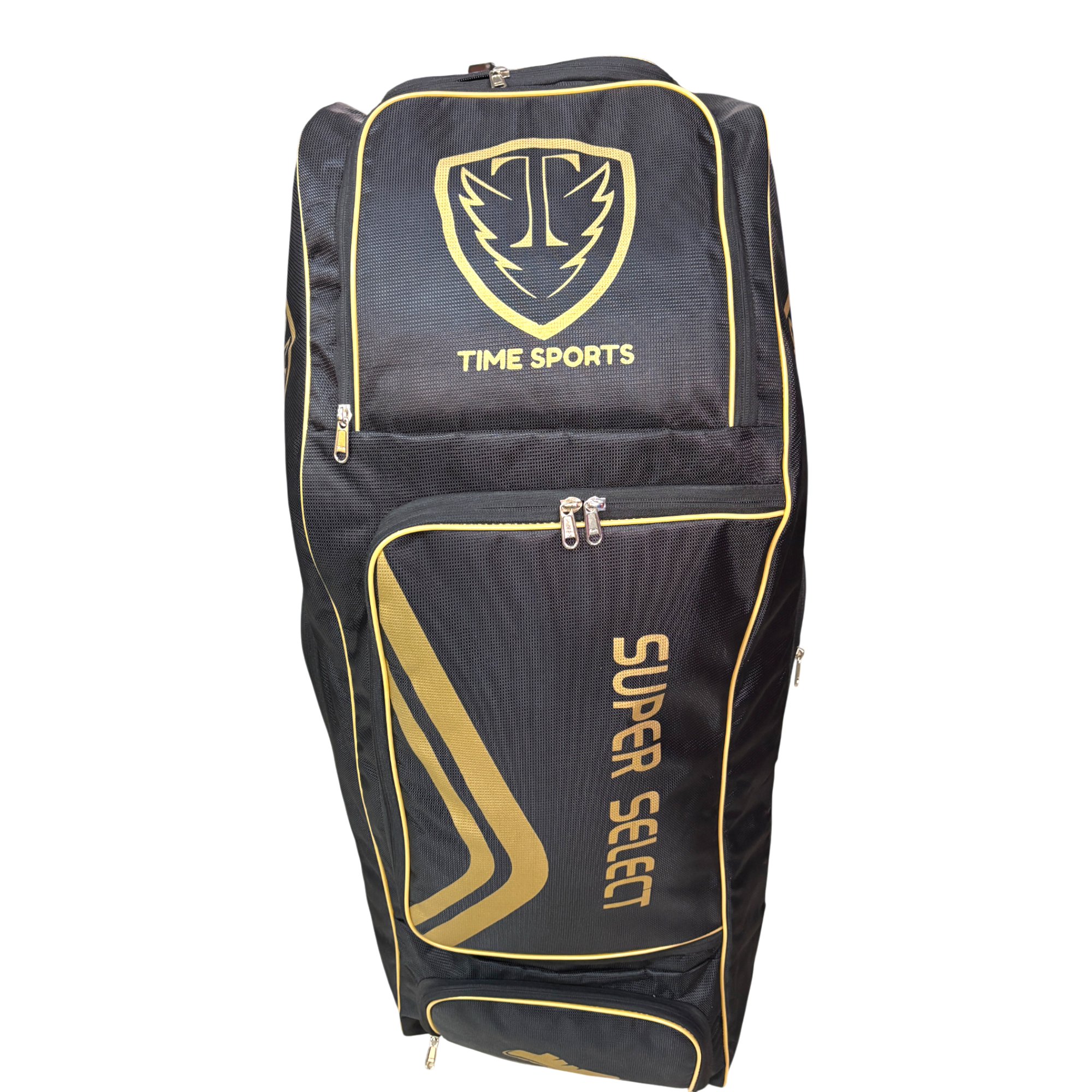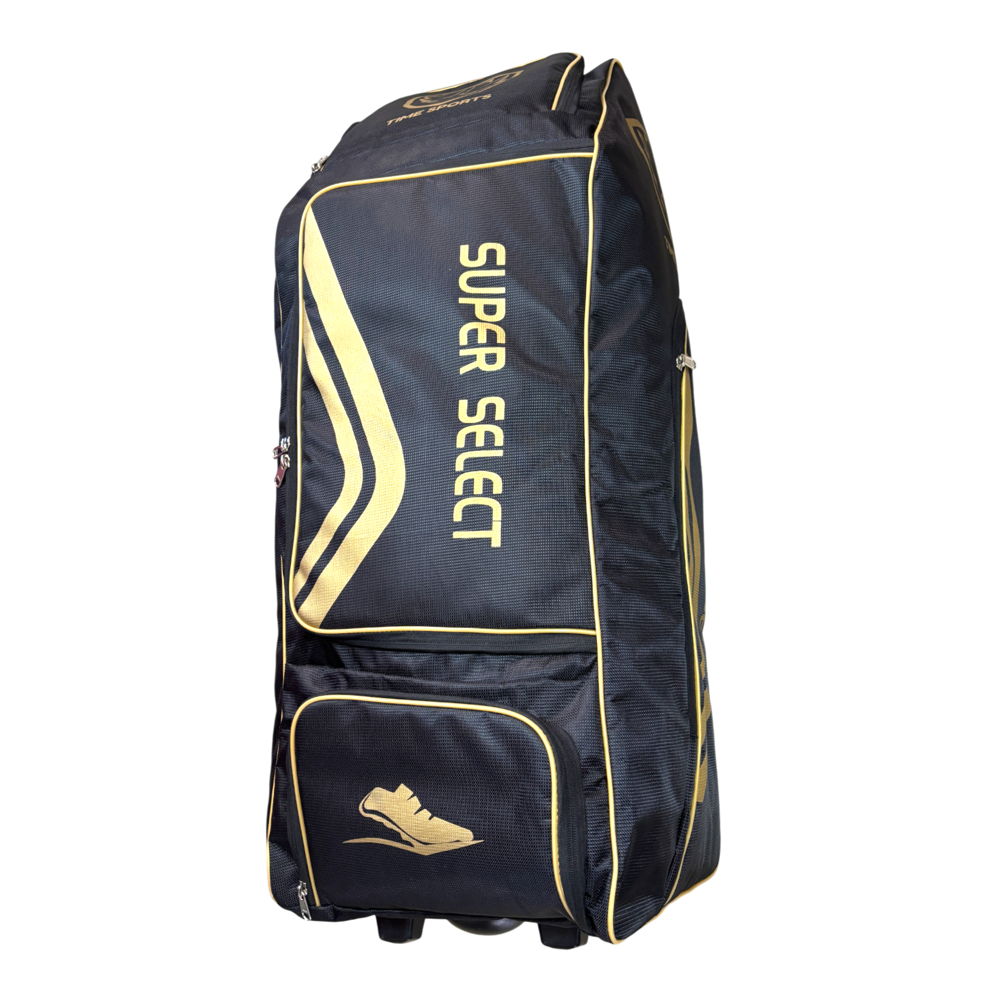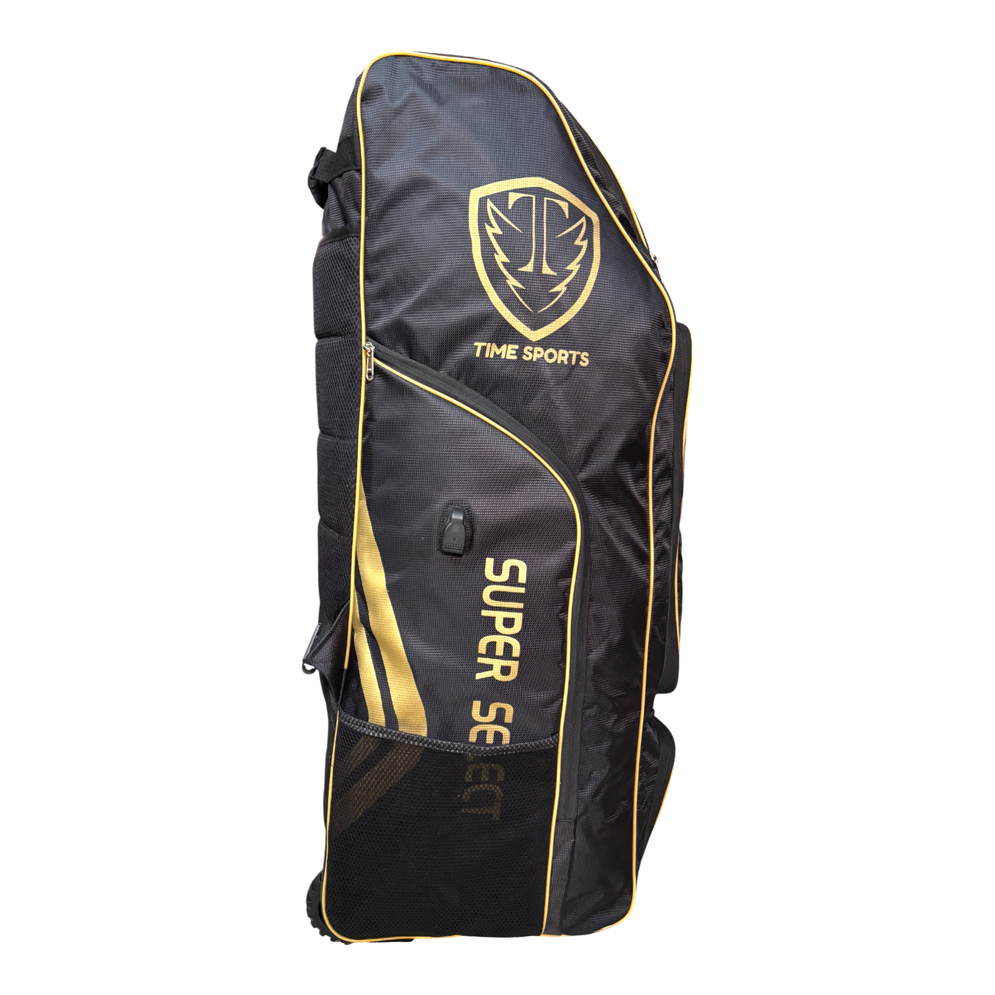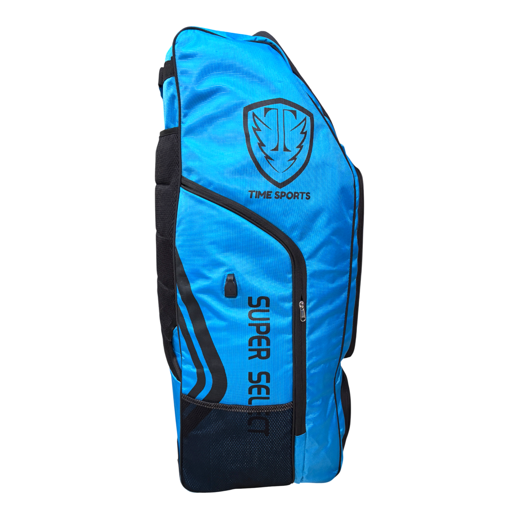 Time Sports Super Select Cricket Kit Bag with Wheels, Large 110L Duffle Style Equipment Bag, Heavy-Duty Zippers, Helmet Pocket, Side Pockets, Built-in Powerbank Support